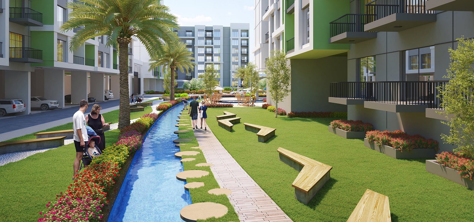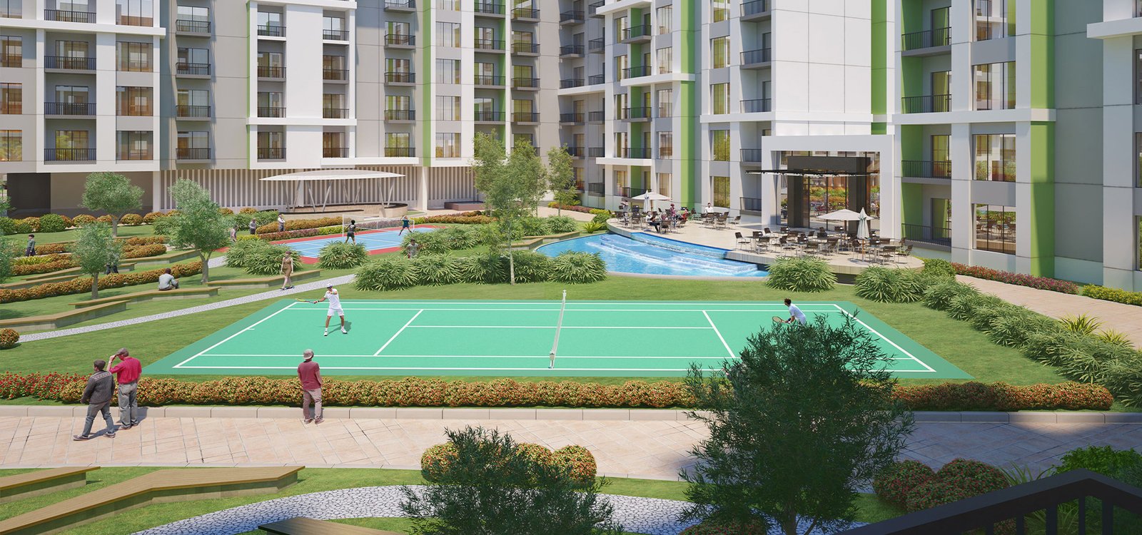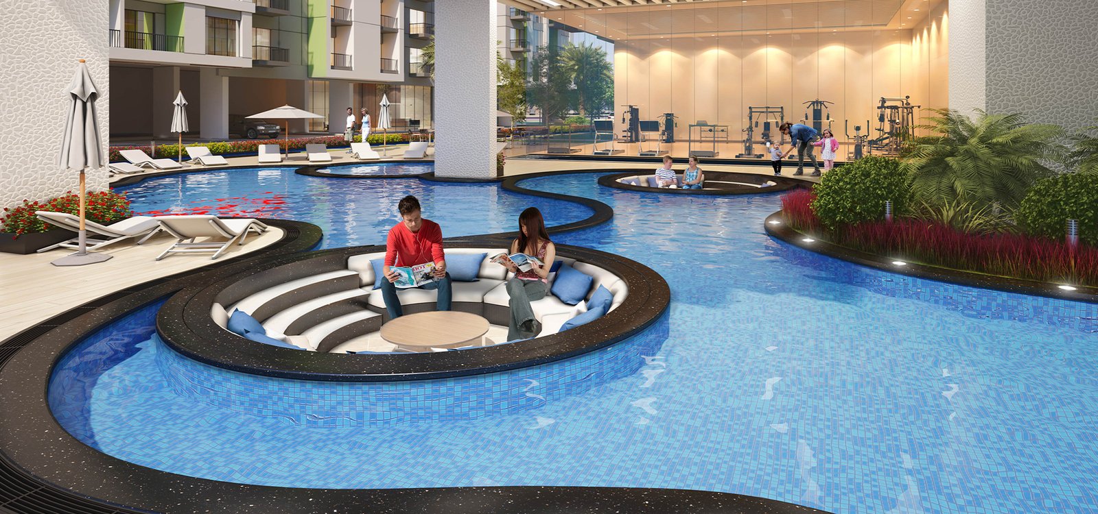 The project features a gym, swimming pool, pool seating, tennis court, and water canal views (among others).